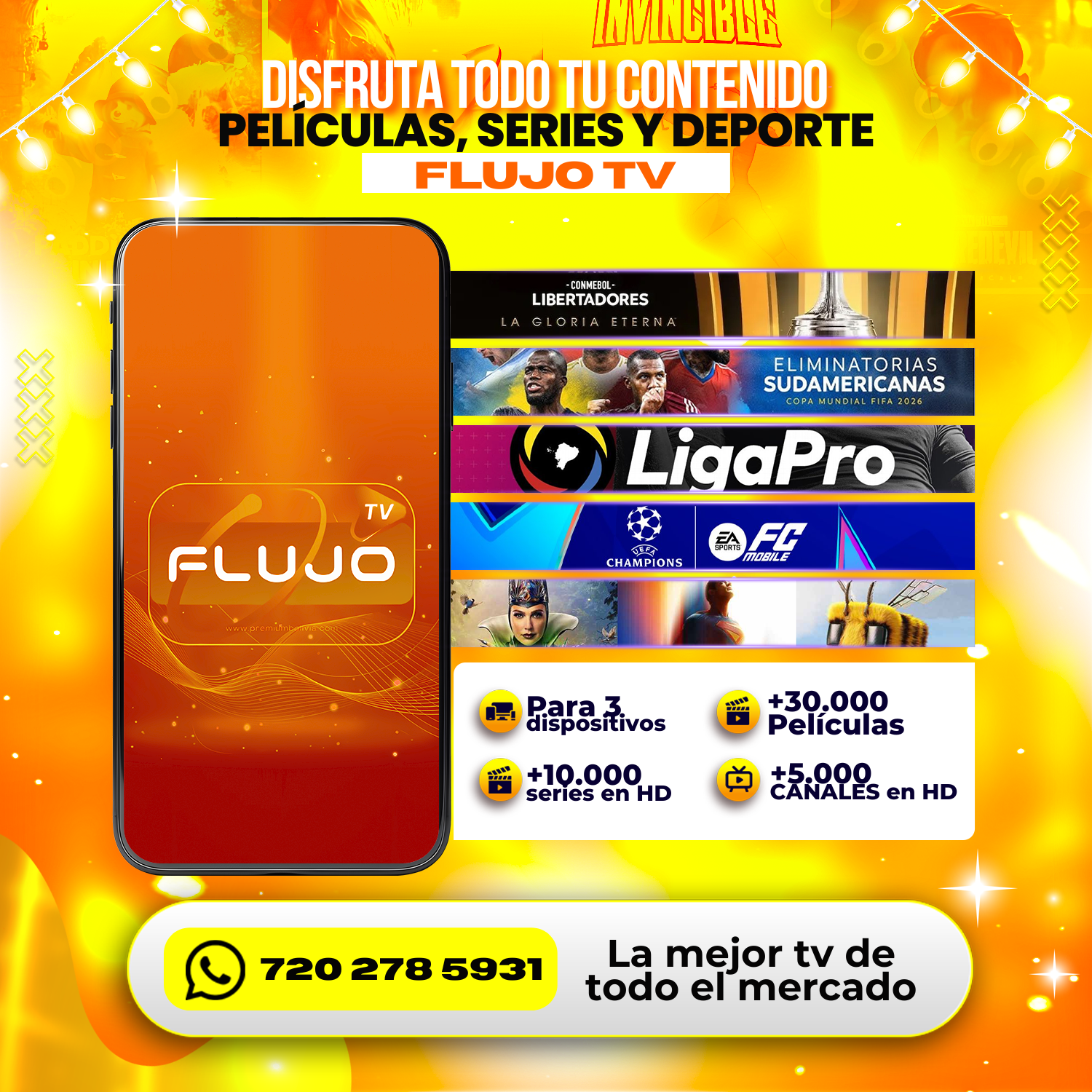 Disfruta de 3 meses continuos con Flujo TV y accede a una amplia variedad de canales en vivo, deportes, películas, series y programación internacional desde un solo lugar. Una excelente opción para quienes buscan entretenimiento constante sin contratos largos.